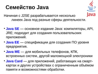 Документ представляет обзор языка программирования Java, включая его историю, ключевые особенности и области применения. Рассматриваются сильные и слабые стороны, архитектура платформы, а также важные моменты развития, такие как версии и их особенности. Java сохраняет высокие позиции на рынке программирования, применяясь в различных сферах, от веб-приложений до встраиваемых систем.