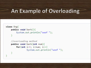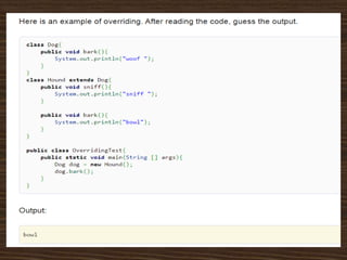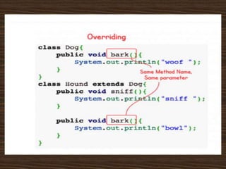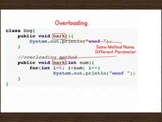 The document provides an introduction to key concepts of Java programming, focusing on object-oriented principles such as inheritance, polymorphism, overloading, overriding, constructors, and encapsulation. It explains how inheritance allows the creation of new classes from existing ones, while polymorphism enables objects to take on multiple forms through method overloading and overriding. Additionally, it covers the importance of constructors and encapsulation in Java, emphasizing how data and methods can be combined into single units.