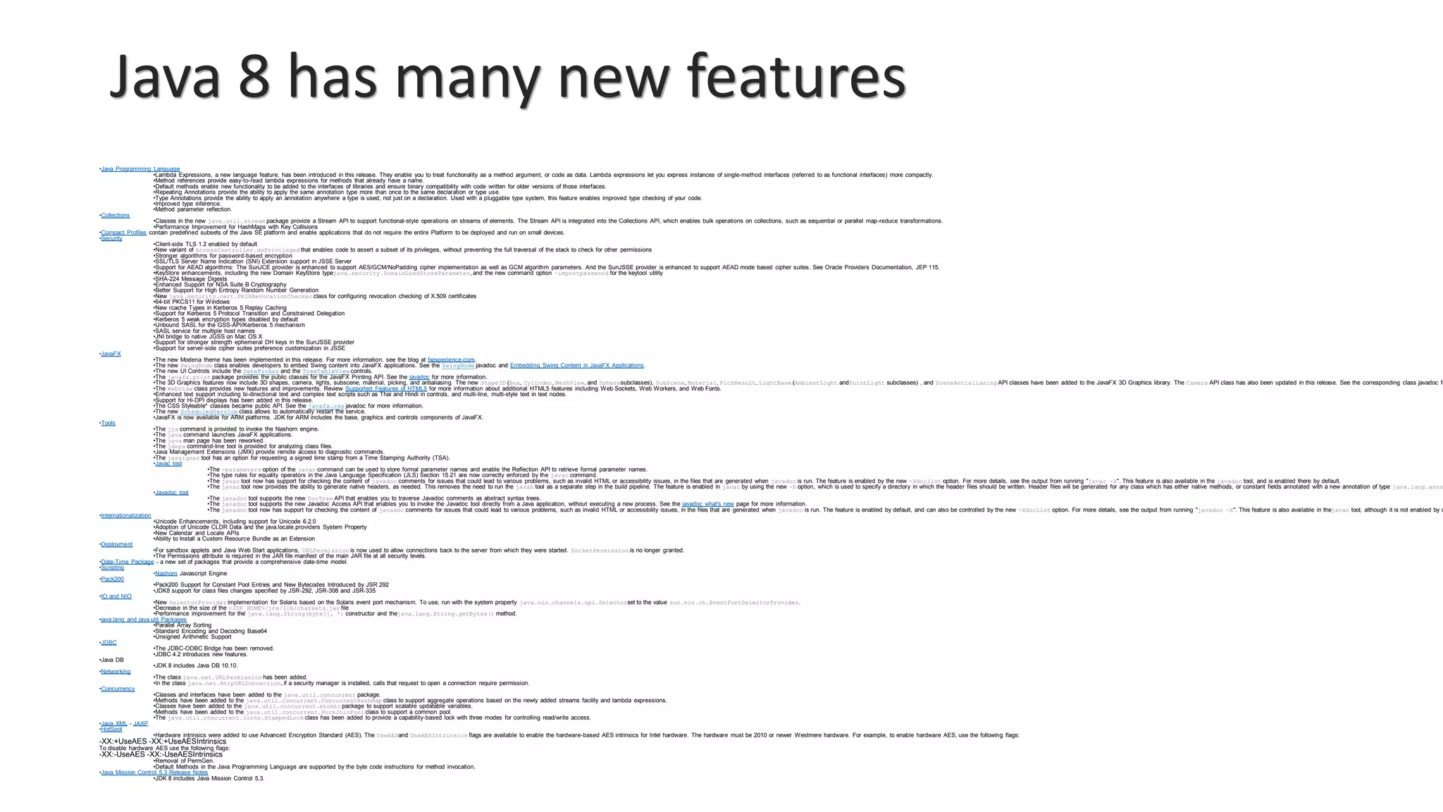 Java 8 introduces several new features including lambda expressions, method references, and default methods that enhance functional programming capabilities and ensure binary compatibility. The release also improves security with client-side TLS 1.2 and stronger encryption algorithms, while adding new API features in JavaFX and enhanced tools for development. Additionally, performance improvements and various class updates across libraries contribute to a more efficient and powerful programming experience.
