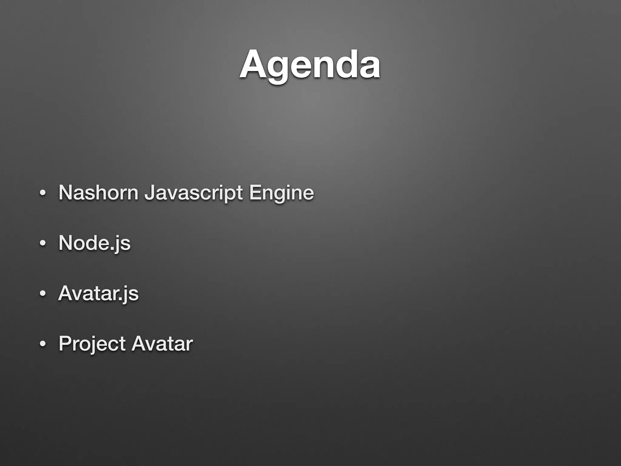 This document discusses Nashorn, a JavaScript engine for Java 8 that replaced the older Rhino engine. It provides an overview of Nashorn's features like improved performance and ECMAScript compliance compared to Rhino. It also introduces Avatar.js, an open source framework that brings the Node.js programming model to the JVM using Nashorn. Finally, it briefly describes Project Avatar, which provides JavaScript services and client frameworks to build applications using Nashorn and Avatar.js that integrate with Java platforms and APIs.