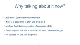 Java 9 will introduce a new module system that will provide code encapsulation and a way to explicitly declare dependencies between modules. Some key changes include the ability to define modules using a module-info.java file, and new parameters for javac and java to support modules. There are still some unresolved issues around module declarations, artifacts, descriptors, graphs, reflection, and versioning that need to be addressed prior to final release. The new module system is aimed at addressing problems like large runtime footprints, classpath issues, and lack of visibility controls between packages.