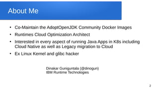 The document discusses optimizing Java applications for container environments, focusing on the use of AdoptOpenJDK and strategies for building efficient Docker images. Key goals include reducing image size, improving startup times, and optimizing resource usage during runtime and idle periods. It also highlights tools and techniques for debugging and monitoring Java applications running in containers.