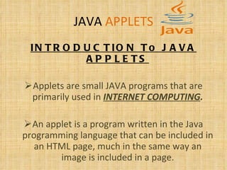 Java applets are small Java programs that can be embedded within HTML pages. When a user views a page containing an applet, the applet code is transferred to their system and executed by the Java Virtual Machine within their browser. Applets allow for interactive features on web pages like capturing mouse input and including buttons or checkboxes. They can also play media formats not natively supported by browsers. Applets are embedded using the applet or object tags, which can specify the applet's location and download any necessary Java plugins.