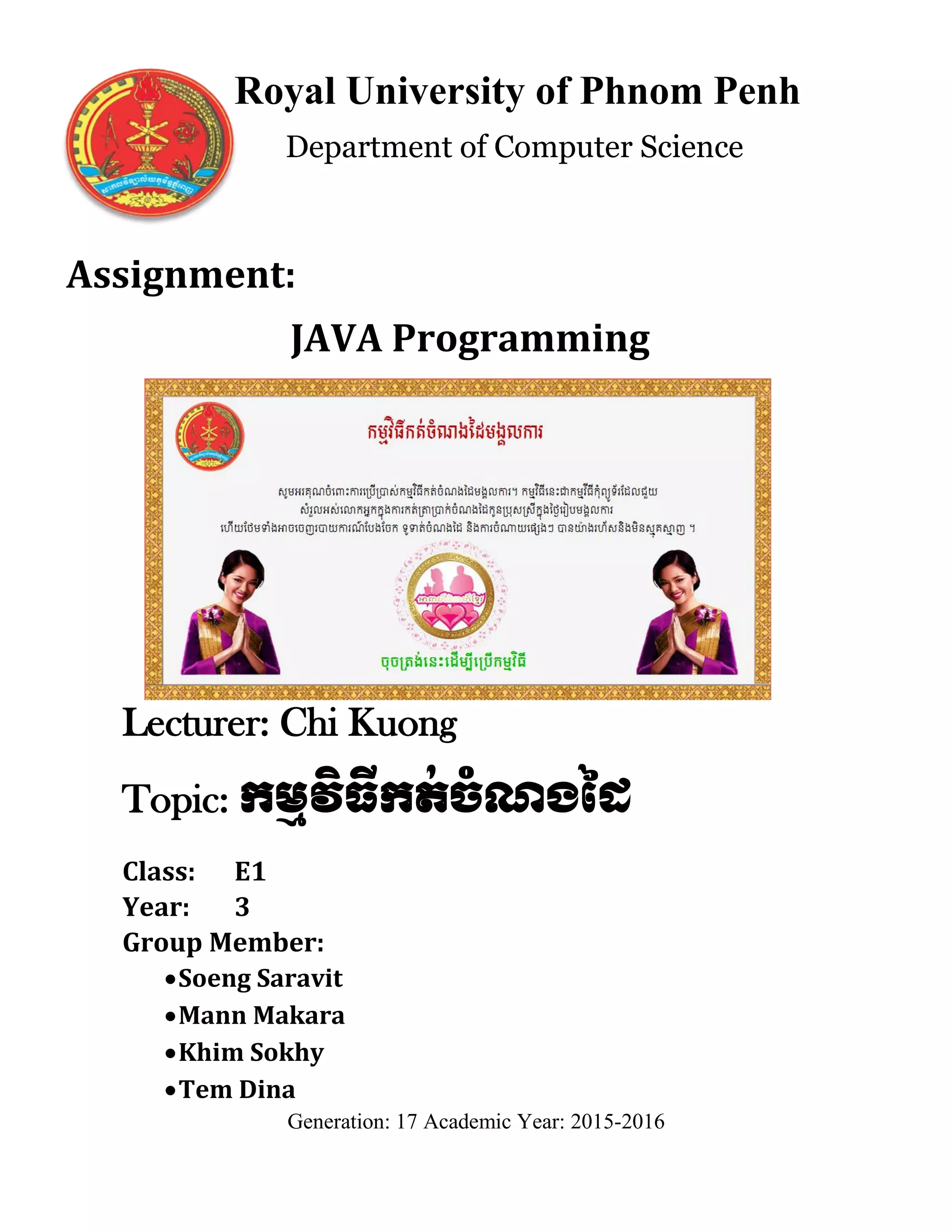 This document describes a Java programming assignment on a wedding planning application. The project aims to address issues with existing wedding planning tools by developing a program that allows users to manage guest lists, update guest money contributions, view reports and more. The program is intended to help organizers reduce errors and save time in planning events. The document outlines the objectives, scope, limitations and expected sections of the program including analysis, design, implementation and figures.