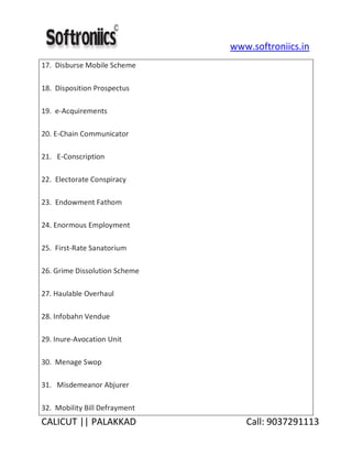 The document lists various services and management systems offered by Softroniics, including educational tools, financial schemes, wildlife management, and digital rights management. It provides contact details and emphasizes a wide range of solutions in sectors such as transport, crisis management, and online engagement. Additionally, the document highlights several themes like employment, auditing, and governmental processes.