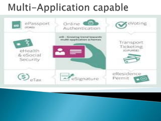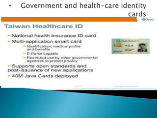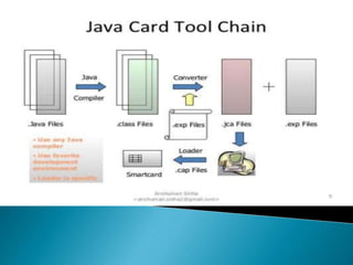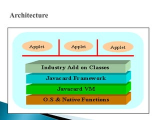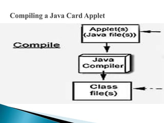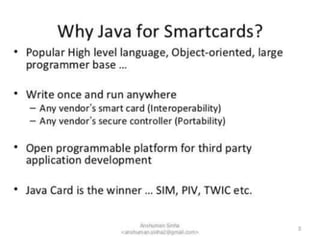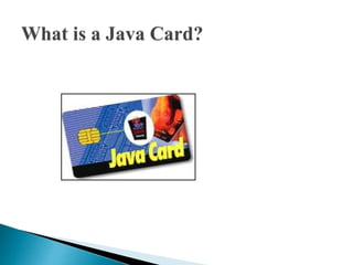 This document discusses a seminar on Java Card, which allows programs written in Java to run on smart cards. It describes what a Java Card is, its architecture, development process, advantages like interoperability and security, and limitations such as restricted memory and lack of some Java features. Applications of Java Cards mentioned include SIM cards, ID cards, and financial cards. The conclusion states that widespread adoption of Java Card will require more promotion, applications, and tools, but that the number of Java Cards could reach millions in the next few years.