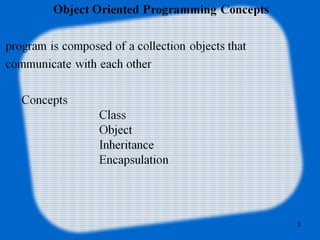 This document provides an overview of classes in Java. It discusses key concepts like class templates, objects, fields, methods, access modifiers, constructors, static members, and class design best practices. Specifically, it defines a class as a template for objects that encapsulates data and functions, and notes that objects are instances of classes. It also explains how to declare fields and methods, the different access levels for class members, and how to define constructors including overloaded and parameterized constructors.