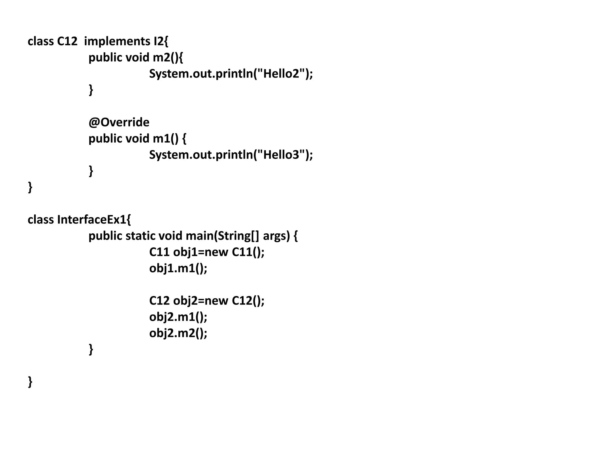 The document defines two interfaces I1 and I2, with I2 extending I1. Class C11 implements I1 and prints "Hello1", C13 extends C11 and overrides m1 to print "Hello4". Class C12 implements I2, overrides m1 to print "Hello3" and defines m2 to print "Hello2". The main method creates objects of C11 and C12, calling their methods. It also defines a Rectangle class with fields length and width, gets user input and checks if width is valid before calculating and printing the area.