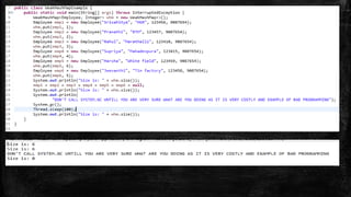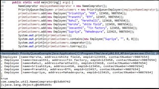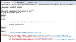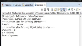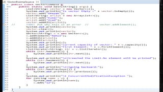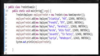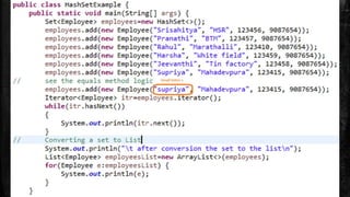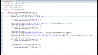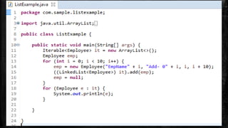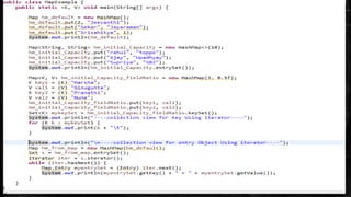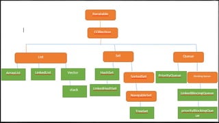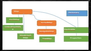 This document provides an overview of Java collections including arrays, lists, sets, queues, and maps. It discusses the key interfaces like List, Set, Queue, and Map and some of their common implementations like ArrayList, LinkedList, HashSet, TreeSet, PriorityQueue, HashMap, LinkedHashMap, and TreeMap. It covers the characteristics of each interface and class, how they are ordered, if they allow duplicates, and whether they are synchronized. The document also discusses navigation techniques like iterators and enumerations and provides examples of using different collection classes.