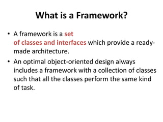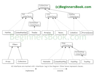 This document discusses Java collections framework and various collection classes like ArrayList, LinkedList, HashSet, HashMap etc. It provides definitions and examples of commonly used collection interfaces like List, Set and Map. It explains key features of different collection classes like order, duplicates allowed, synchronization etc. Iterators and generic types are also covered with examples to iterate and create typed collection classes.