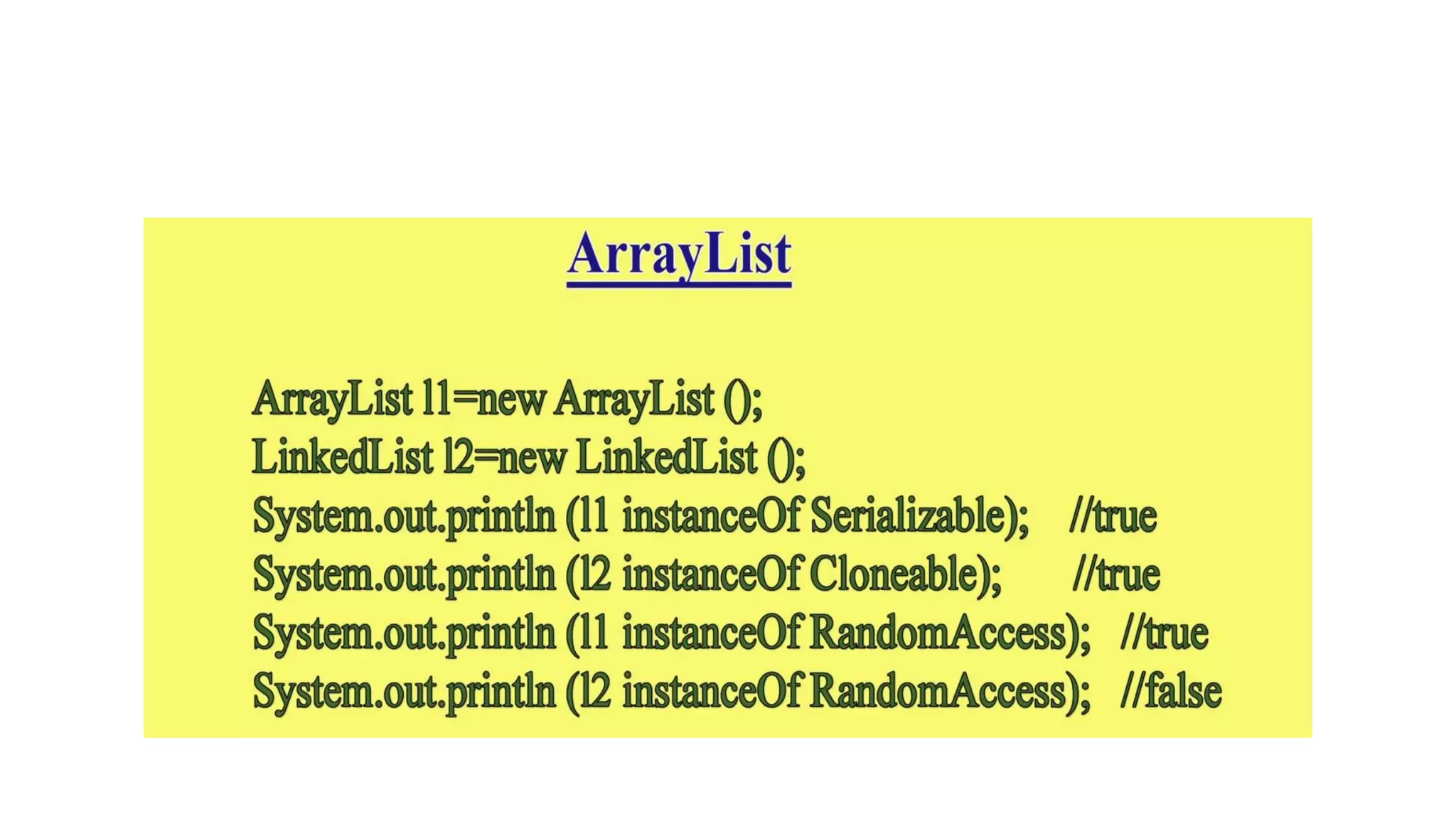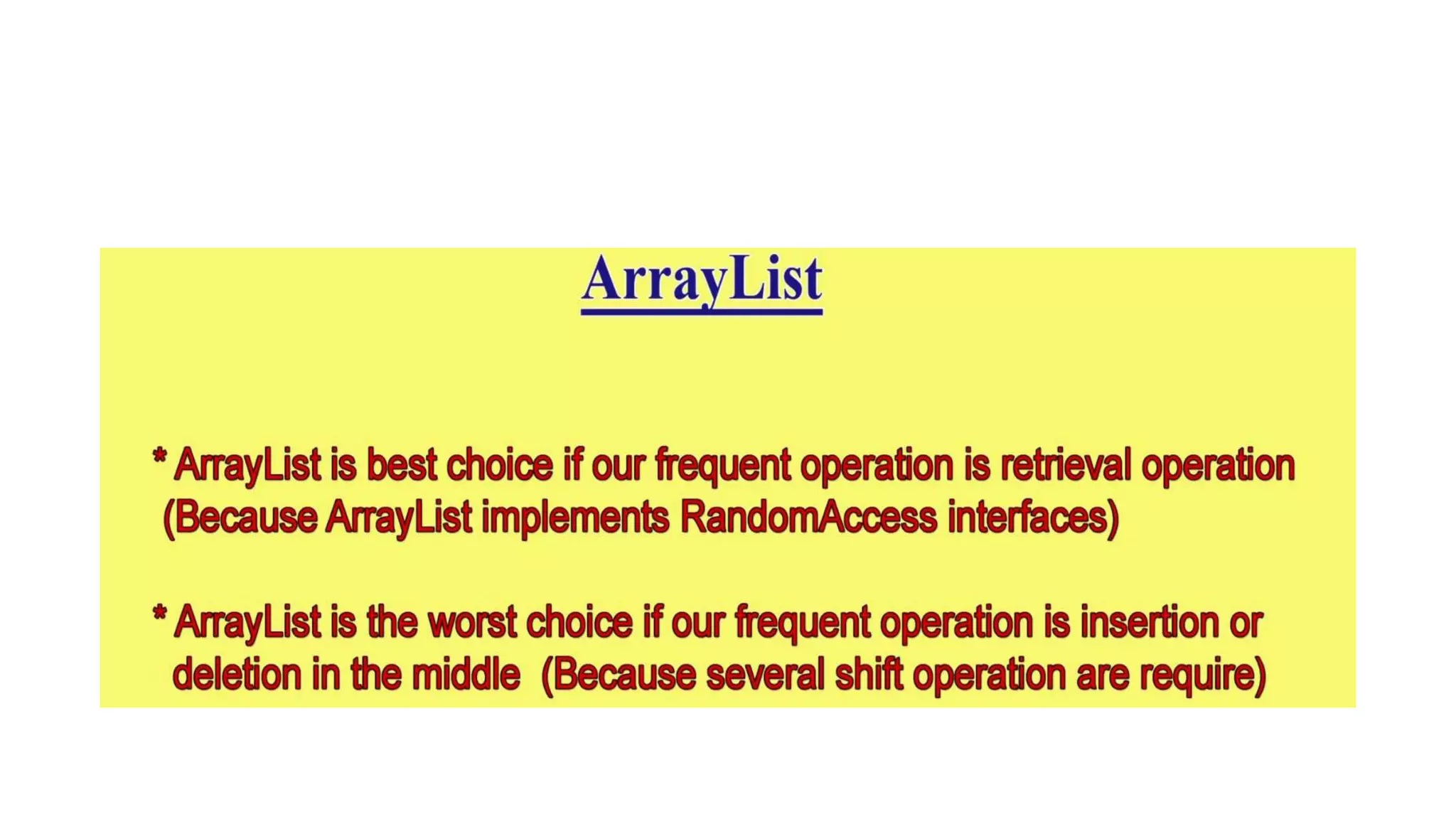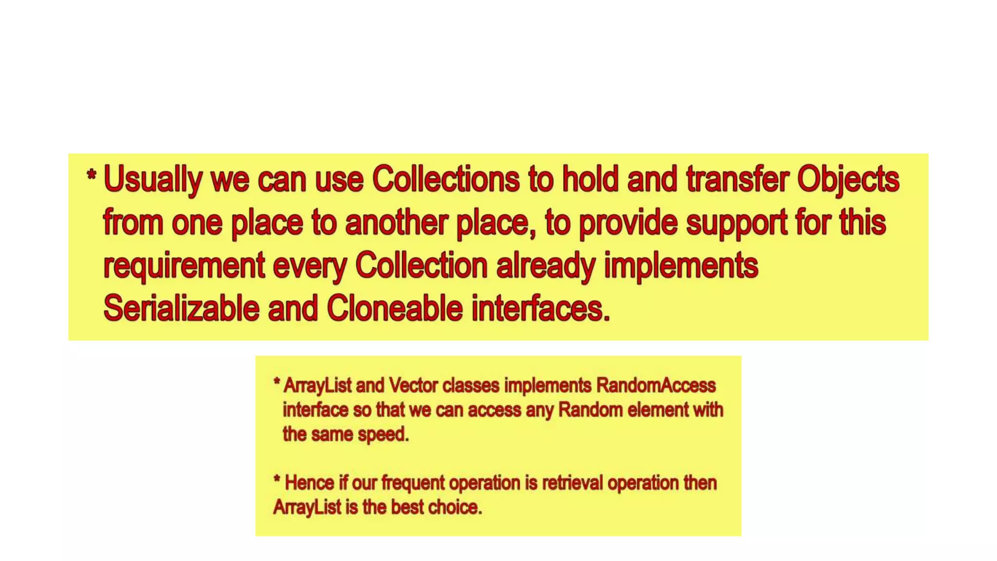 This document provides an overview of Java collections and key interfaces in the collection framework. It discusses Collection, List, Set, SortedSet, Queue, Map interfaces and their implementations like ArrayList, LinkedList, HashSet, TreeSet, PriorityQueue, HashMap, TreeMap. It covers differences between various collections, constructors, methods, and examples. Key differences between implementations like ArrayList vs LinkedList, HashMap vs HashTable are explained. Concepts like iterators, comparators are also summarized.