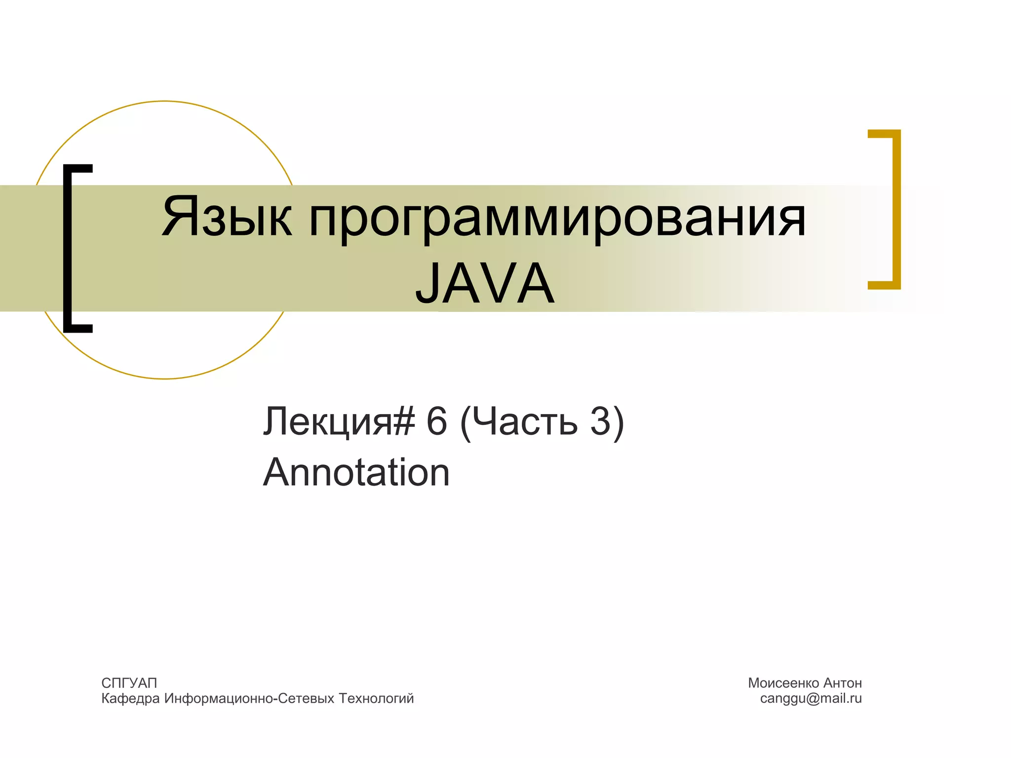 Документ представляет собой лекцию по аннотациям в языке программирования Java, имеющую содержание, включая применение аннотаций, примеры и параметры аннотаций. Основное внимание уделяется стандартным аннотациям, собственным аннотациям и методам их обработки. Лекция также охватывает использование аннотаций для метаданных, генерирования документации и управления временем жизни аннотаций.