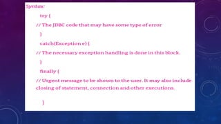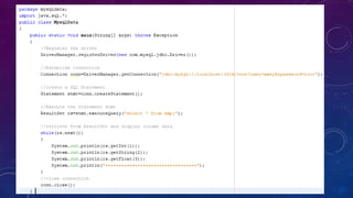 The document provides an overview of Java Database Connectivity (JDBC), detailing its architecture, various driver types, and their specific functionalities for connecting Java applications to different database systems. It describes how JDBC enables communication via SQL statements, including using Connection, Statement, PreparedStatement, and CallableStatement interfaces to interact with databases. Additionally, it outlines the steps for creating a JDBC application, including importing packages, registering drivers, establishing connections, and executing queries.