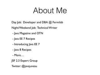 Java EE 8 will include updates to several existing specifications as well as new specifications. Key updates include JMS 2.1, JAX-RS 2.1, JSF 2.3, CDI 2.0, and JSON-P 1.1. New specifications include JCache 1.0, JSON-B 1.0, MVC 1.0, and Java EE Security API 1.0. Java EE 8 is currently in development, with early drafts of specifications and milestones available to provide feedback on. A final release is planned for Q3 2016.