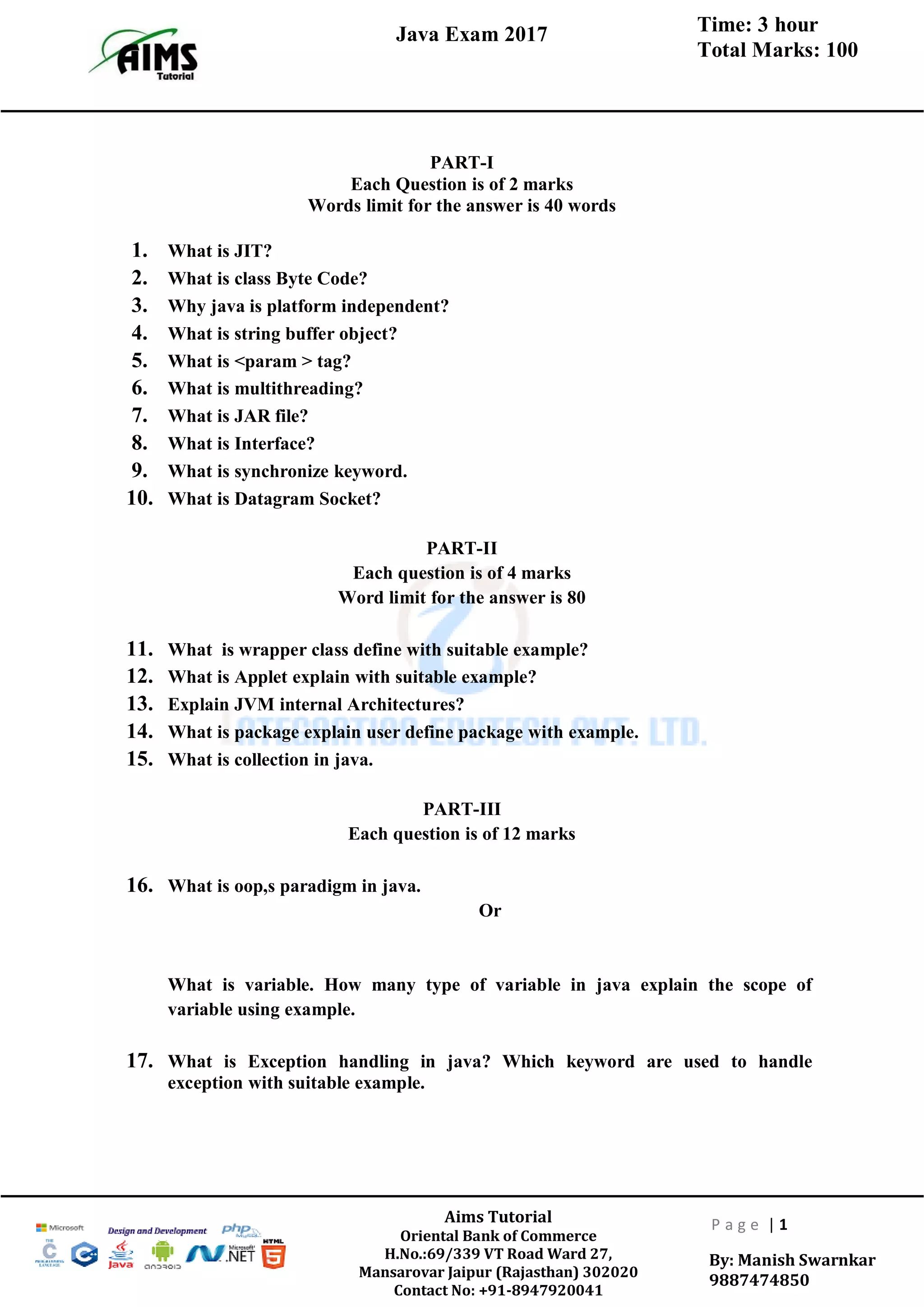 - The document provides sample questions that will be asked to test knowledge of Java concepts like JIT, class bytecode, interfaces, exceptions, OOPs, variables, multithreading, applets, and JDBC.