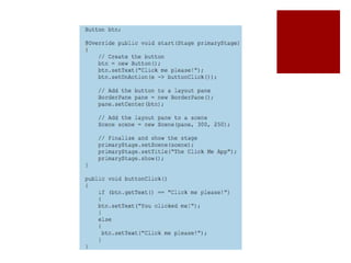 JavaFX is a software platform for building rich internet applications that can run across various platforms. It includes Java packages that allow developers to add graphical user interfaces to Java applications. JavaFX uses concepts like stages, scenes, and nodes to define application layout and user interface elements. Common JavaFX packages provide functionality for application lifecycles, stages, scenes, layouts, and controls.
