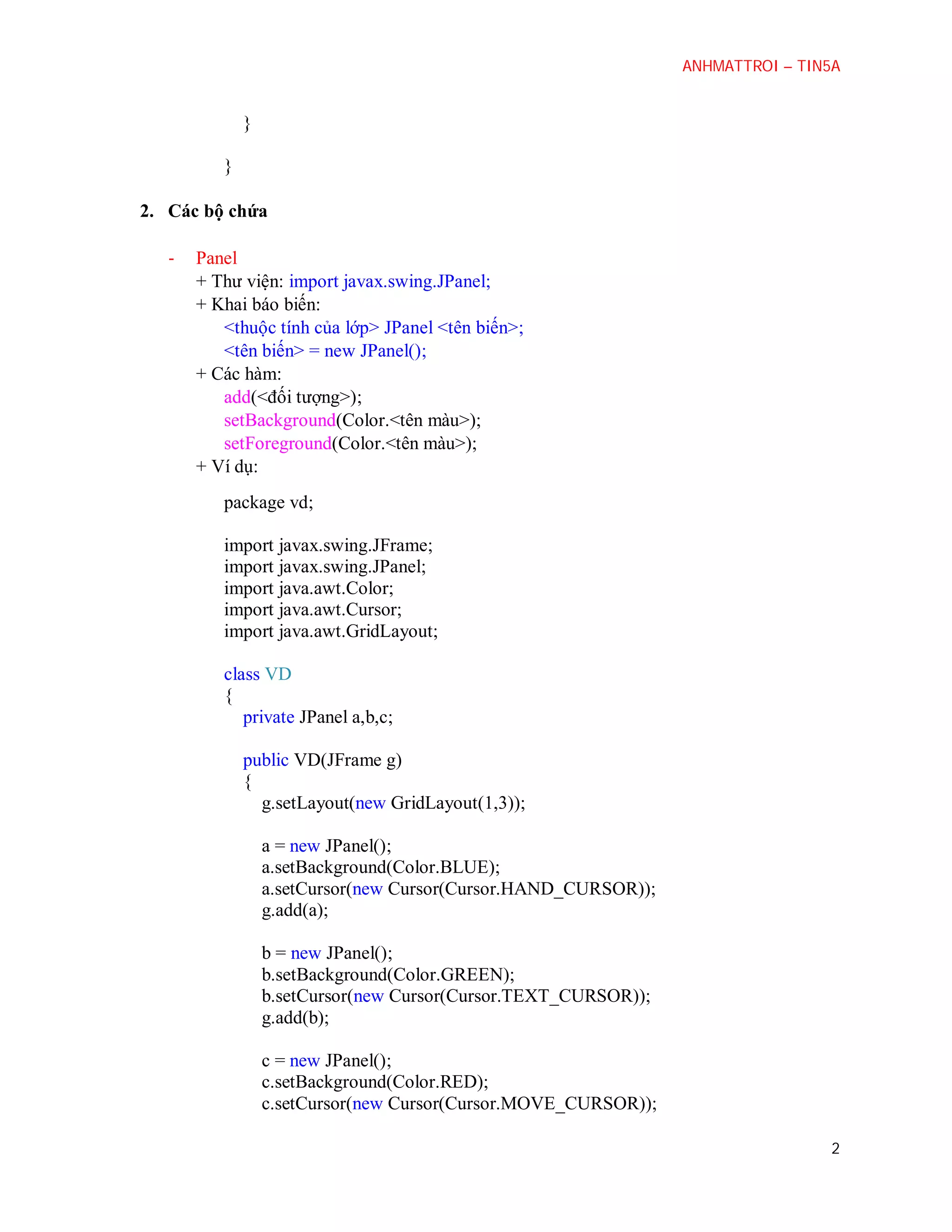 Tài liệu mô tả cách tạo giao diện người dùng bằng Java Swing, bao gồm cách tạo cửa sổ, panel, scrollpane và các đối tượng điều khiển như label, button, textfield, checkbox và radiobutton. Nó cung cấp hướng dẫn cụ thể về cách khai báo, khởi tạo và quản lý các thành phần giao diện, cũng như việc xử lý sự kiện người dùng. Tài liệu có ví dụ minh họa chi tiết để người đọc dễ dàng hiểu và áp dụng.