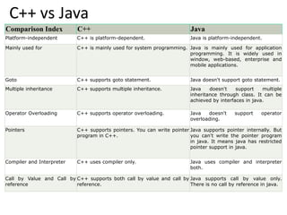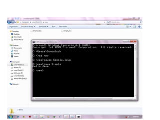 Java is a widely used programming language that is mainly used for application programming. It is platform-independent and supports features like multi-threading and documentation comments. The key aspects of a simple Java program are that it must contain a class with a main method that can be the starting point of execution. The main method has a specific signature of public static void main(String[] args). When a Java program is run, the JVM (Java Virtual Machine) loads and executes the program by performing operations like loading code, verifying code, and providing a runtime environment.