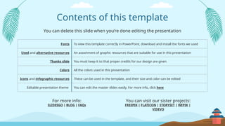 The document outlines a presentation template focused on planets in the solar system, detailing features like editable slides, graphic resources, and instructions for use for both free and premium users. It includes information about individual planets such as Mercury, Venus, and Mars, as well as guidelines for creating effective presentations. Additionally, it highlights alternative resources and contains credits for design elements used in the template.