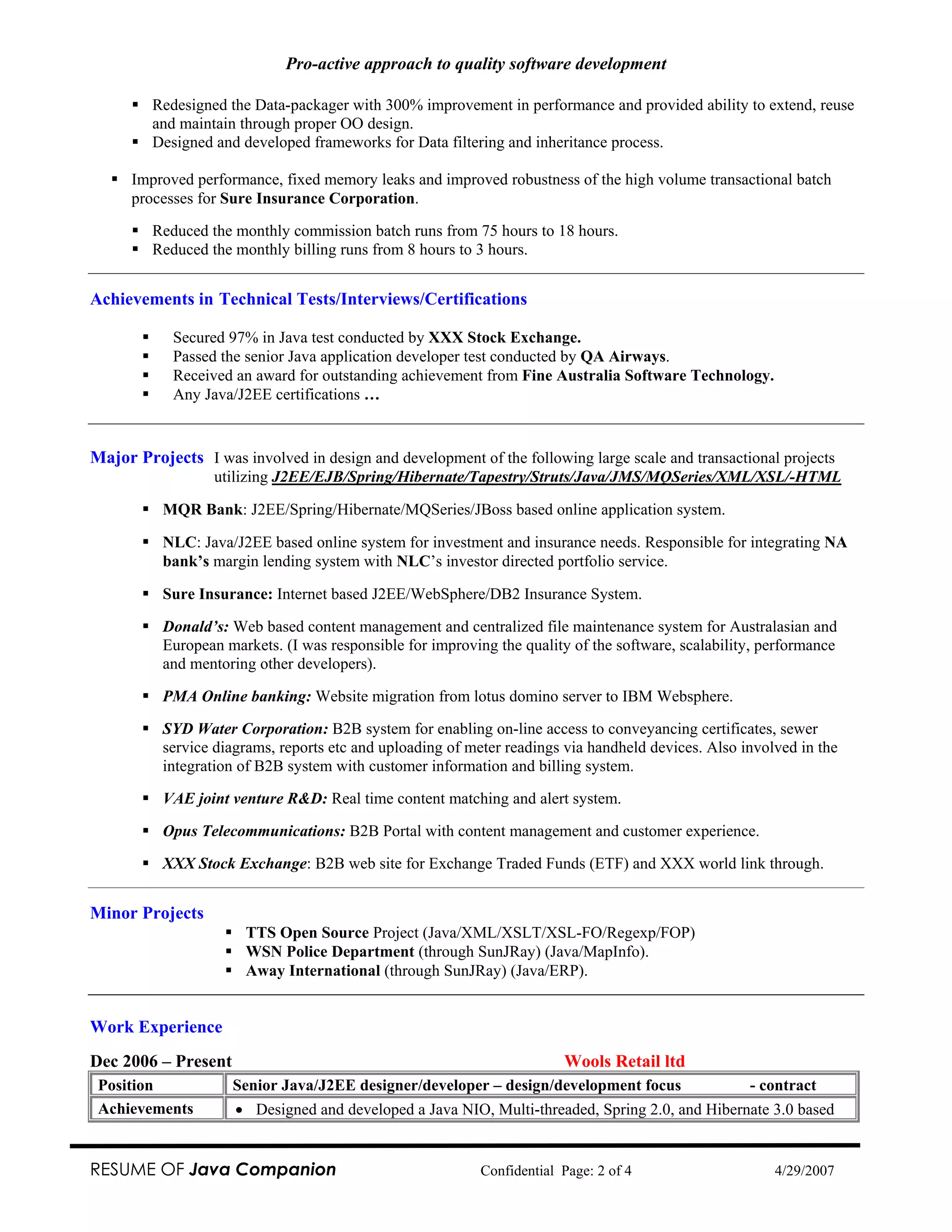 The document is a resume for a Java/J2EE developer with over 15 years of experience designing and developing large enterprise applications using technologies like Java, J2EE, Spring, Hibernate, XML, and various middleware platforms. Some of the major projects listed include developing online banking applications, insurance systems, and portals. The resume highlights skills, achievements, and responsibilities on past projects to demonstrate a strong background in software architecture, design patterns, performance tuning, and leading development teams.