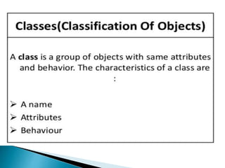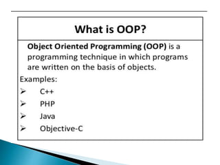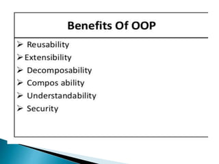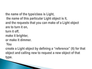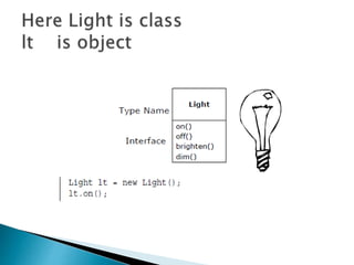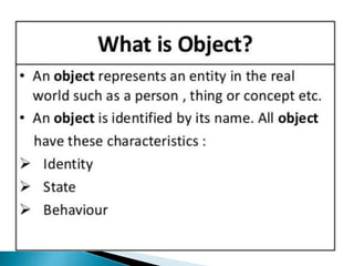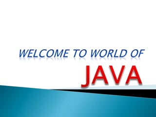 This document provides an overview of Java and its key features. It discusses how Java was created to be platform independent and allow code to run on any system. The document introduces the Java Virtual Machine (JVM) which allows Java bytecode to run on any platform. It describes some of Java's main features like being object-oriented, robust, secure, and architecturally neutral. The document also compares Java to C++ and discusses some limitations of Java. Example Java code is provided to demonstrate a simple class and method definitions.