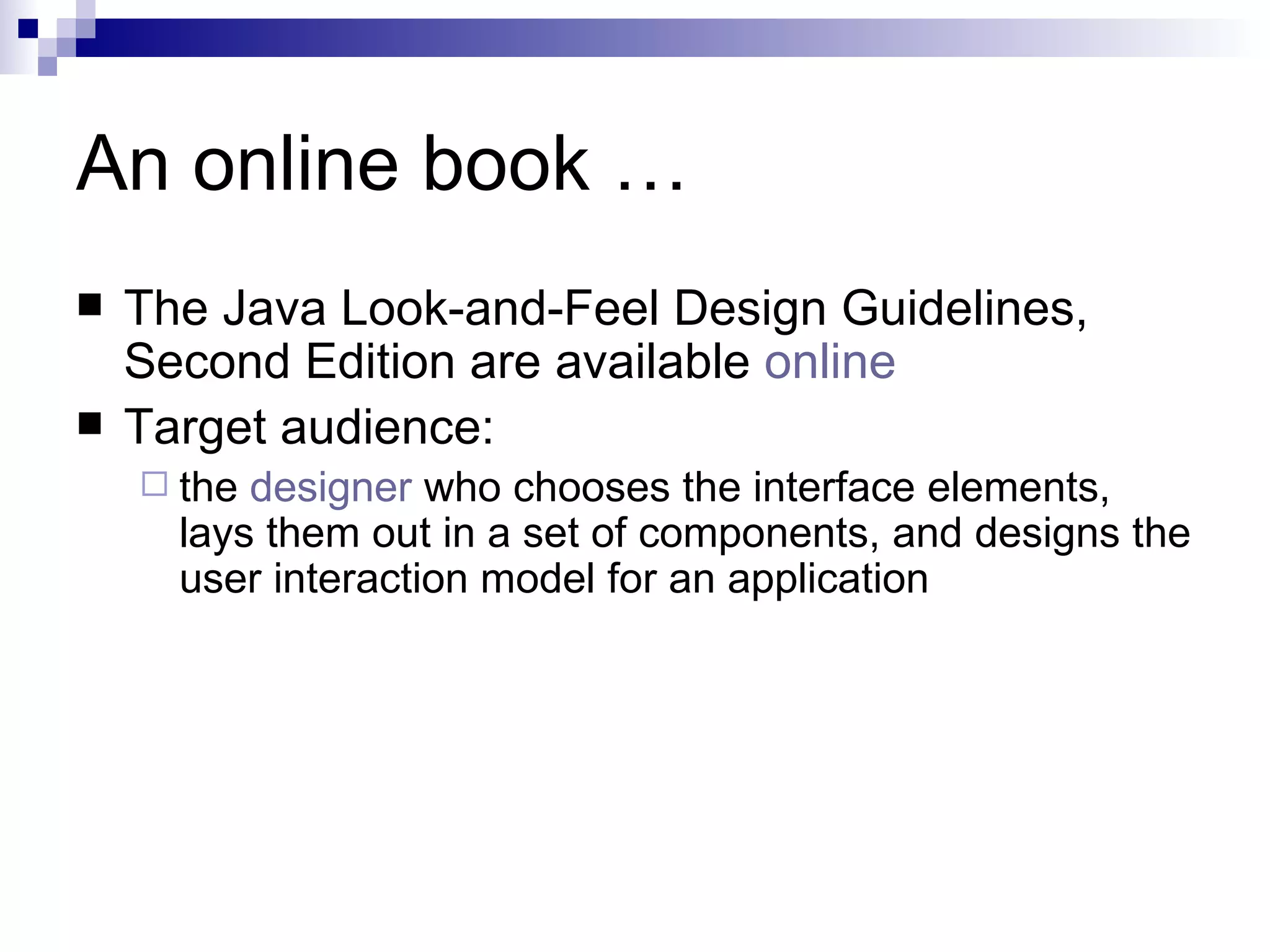 The document discusses the Java Look-and-Feel Design Guidelines, which provide recommendations for designing graphical user interfaces that have a consistent appearance and behavior across multiple platforms. It focuses on using the Swing classes and Java look and feel to create cross-platform GUI applications. Key elements of the Java look and feel discussed include menus, toolbars, editor panes, dialog boxes, and support for internationalization, accessibility, and different look and feel designs.