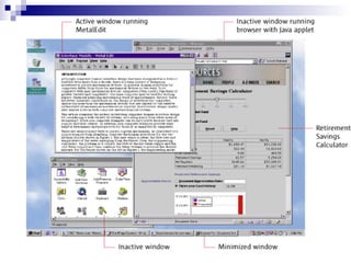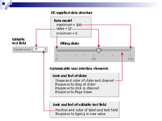The document discusses the Java Look-and-Feel Design Guidelines, which provide recommendations for designing graphical user interfaces that have a consistent appearance and behavior across multiple platforms. It focuses on using the Swing classes and Java look and feel to create cross-platform GUI applications. Key elements of the Java look and feel discussed include menus, toolbars, editor panes, dialog boxes, and support for internationalization, accessibility, and different look and feel designs.