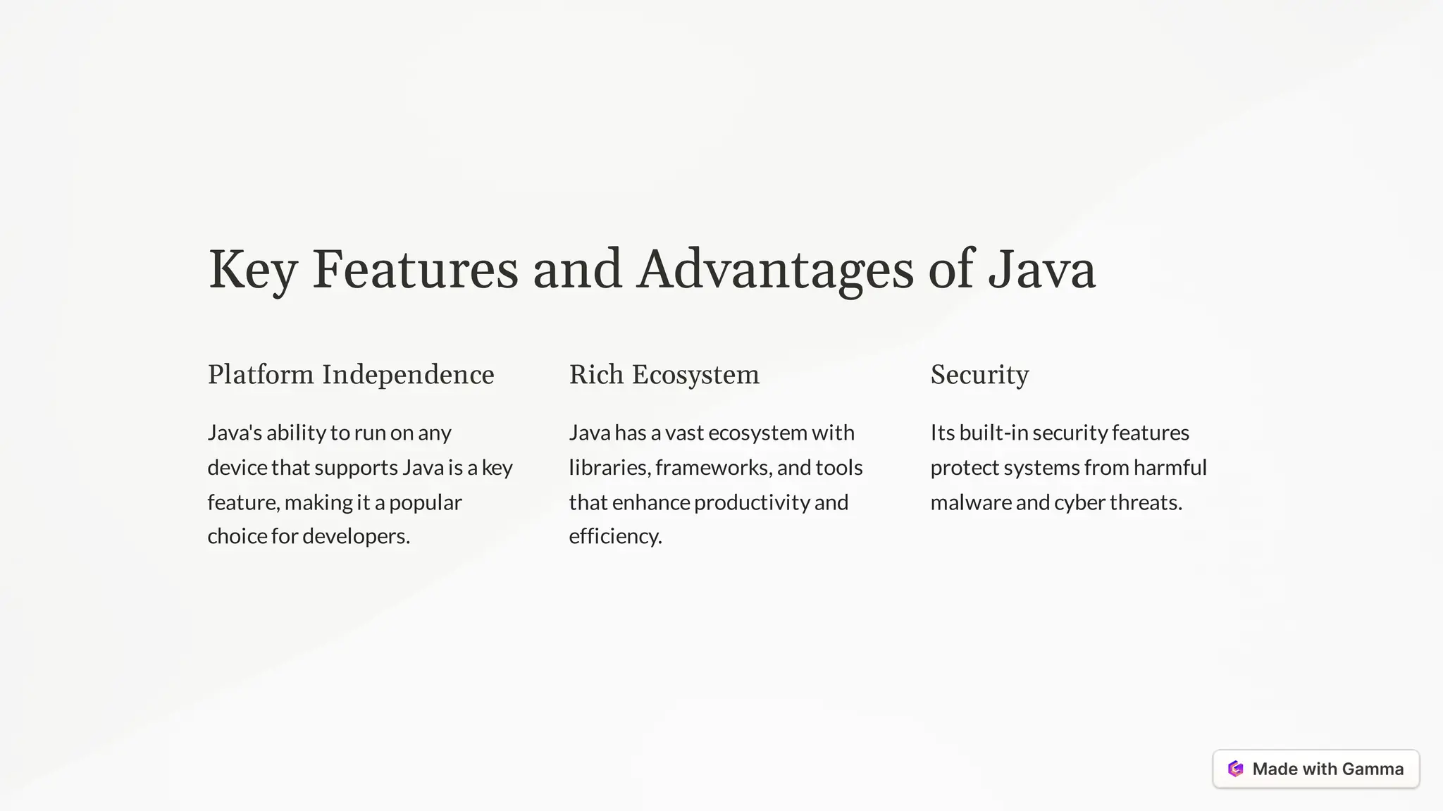 Java is a versatile programming language known for its platform independence, security features, and extensive community support, making it crucial for application development and enterprise solutions. Its ecosystem includes numerous libraries and tools, and it is widely adopted by over 9 million developers worldwide. The future of Java looks promising due to its continued innovation, adaptability to new technologies, and global influence in the software industry.