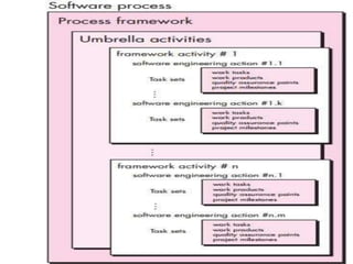 Software is the set of instructions and data that enable computers to function. It encompasses computer programs, data storage, and documentation. There are different types of software including generic products sold broadly and customized products tailored for specific customers. Software engineering aims to develop software through systematic, disciplined processes to produce reliable and efficient software economically. It involves layers of process, methods, tools, and a quality focus. A generic software process framework includes activities like communication, planning, modeling, construction, and deployment managed through umbrella activities.