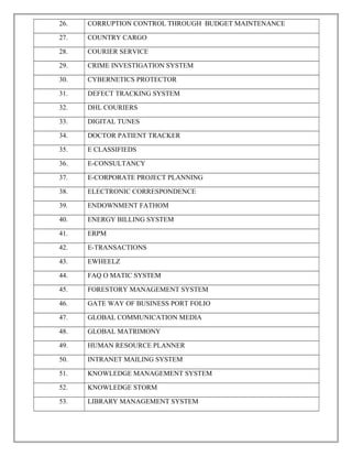 The document lists 101 potential Java non-IEEE projects using various web application frameworks like Struts. The projects cover a wide range of domains including online ticketing, prison management, shopping carts, hospital management, and social networking. Specific project ideas include railway ticketing, e-post office software, college admission and attendance systems, as well as applications for banking, healthcare, recruitment, and more.