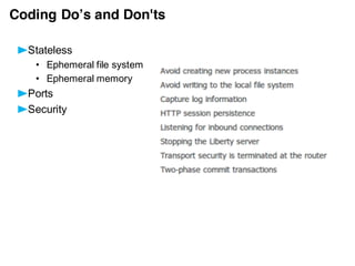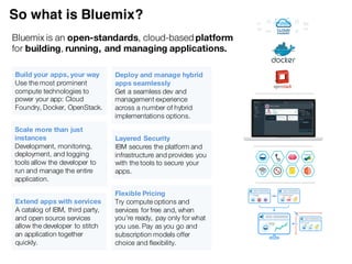 The document provides an overview of IBM Bluemix, a cloud platform for Java development, highlighting its features such as service integration, automated scaling, and security. It details the use of Bluemix with Java through the Liberty buildpack, the advantages of using Docker containers, and best practices for cloud applications. Additionally, it emphasizes the flexibility and choices available for developers using the platform while including disclaimers about potential future product plans and performance expectations.