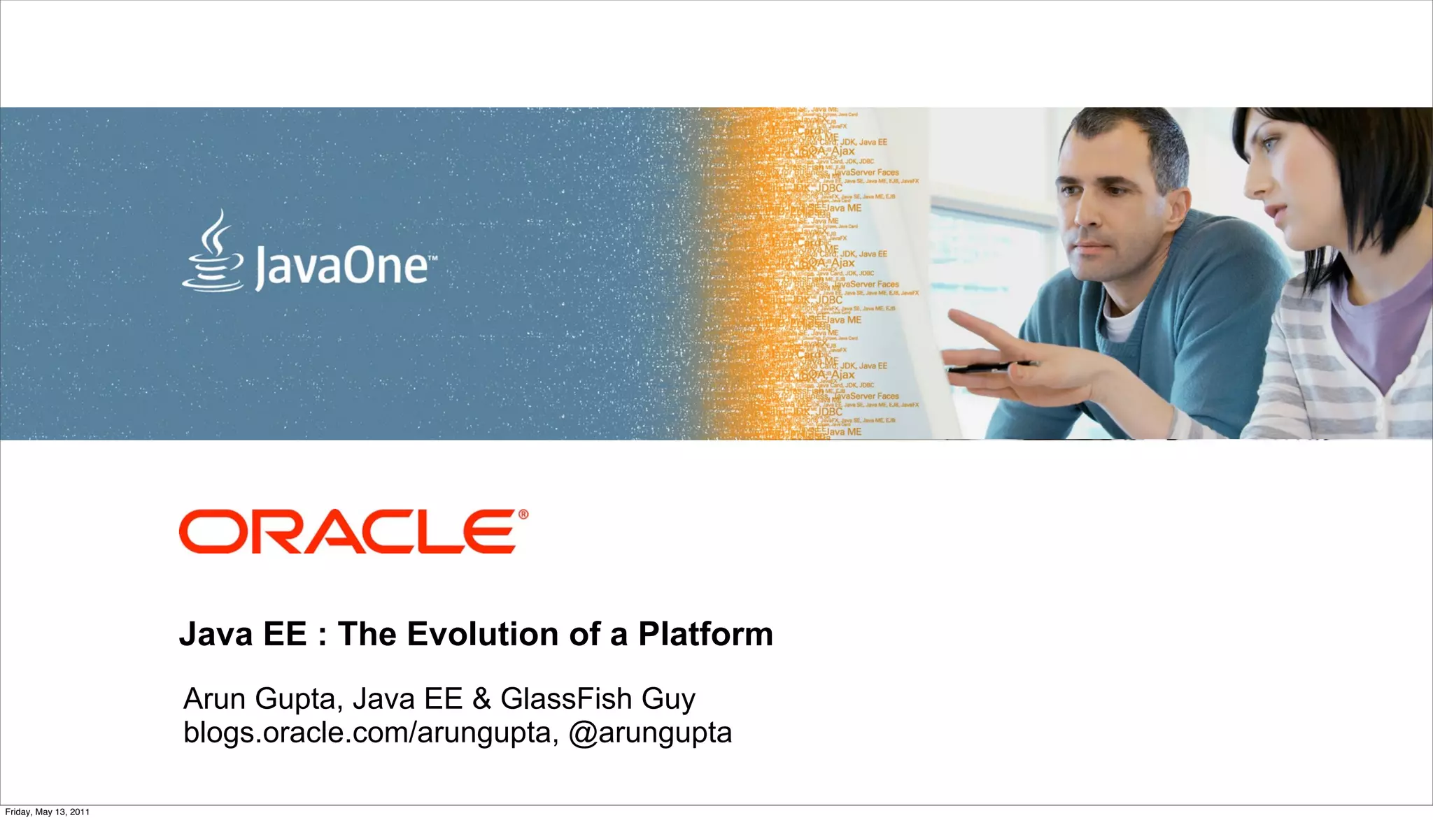 The document outlines the evolution of the Java EE platform, including past, present, and future directions. It discusses Java EE 6 features like the core programming model, top 10 favorite features, and sample applications. It also discusses the future of Java EE for the cloud, including tighter requirements for resource management, common APIs, and modularity through explicit dependencies and versioning between application modules.