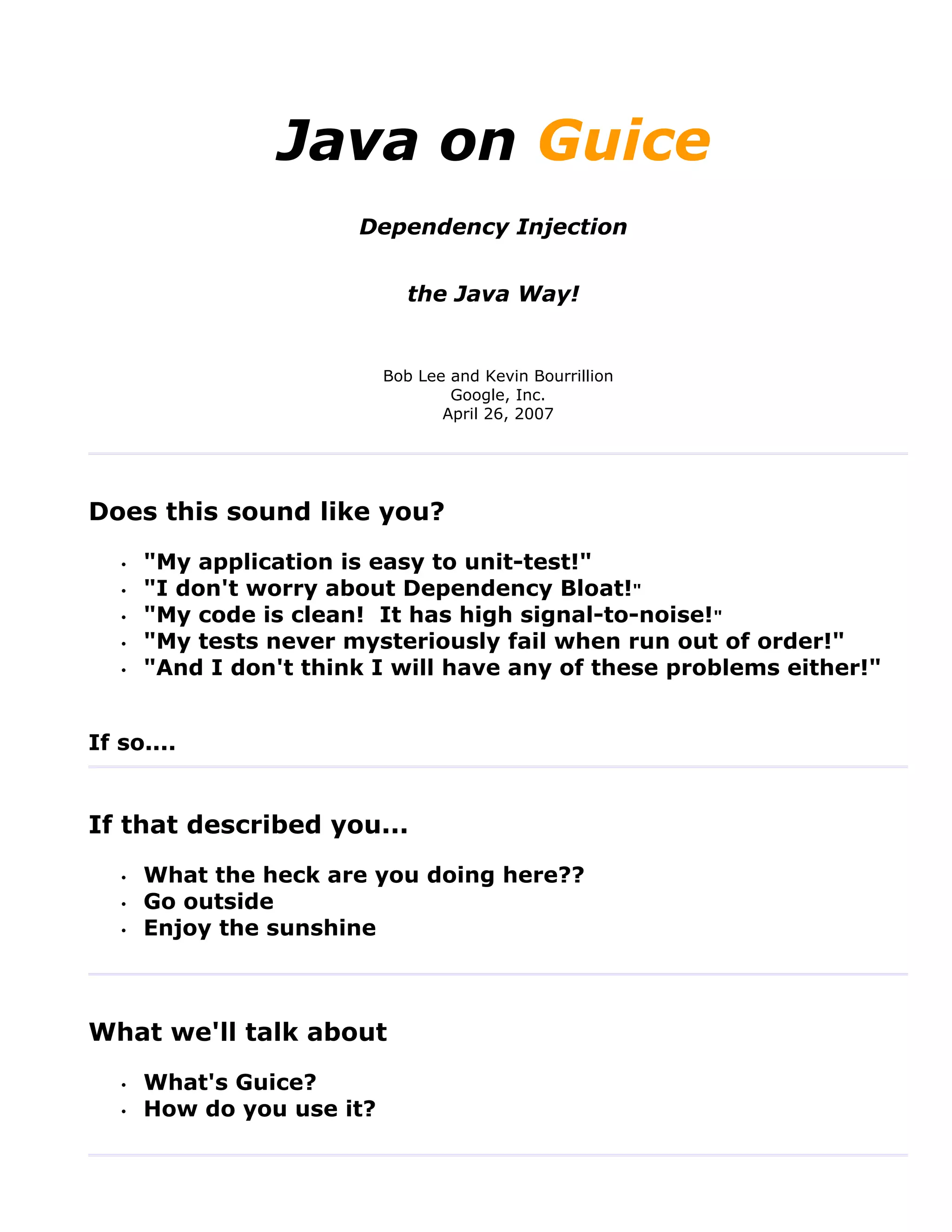 The document discusses Google Guice, an open source framework for Java that supports dependency injection. It provides examples of how to use Guice to inject dependencies into classes through field injection, method injection, and constructor injection. It also covers how to define modules to configure dependency bindings and scopes like singletons. The document is intended to introduce developers to the basics of using Guice for dependency injection in Java applications.