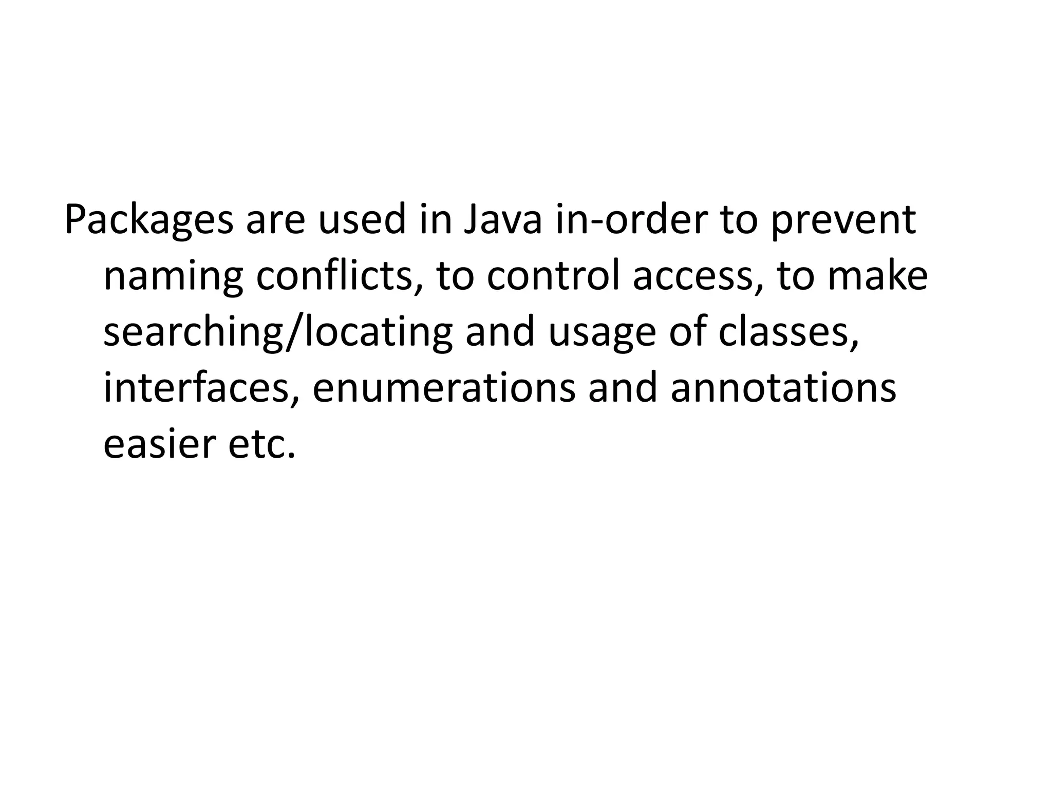Packages in Java are used to organize classes and provide namespace management to avoid naming conflicts. A package groups related types like classes, interfaces, enums and annotations. Programmers can define their own packages to organize related classes. Packages create a new namespace to avoid conflicts and make classes easier to locate and access. The package name is specified in a source file using the package keyword and files for a package must be stored in a subdirectory matching the package name. Classes in other packages can be accessed using their fully qualified names or by importing the package.