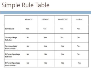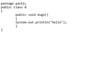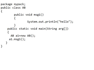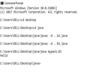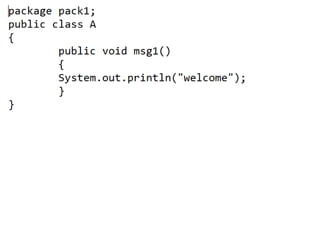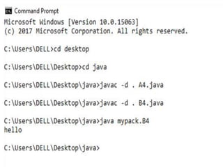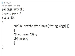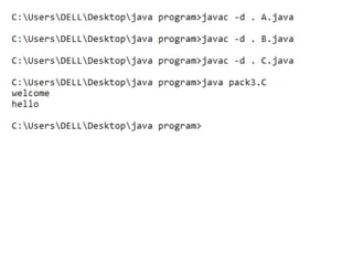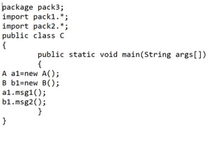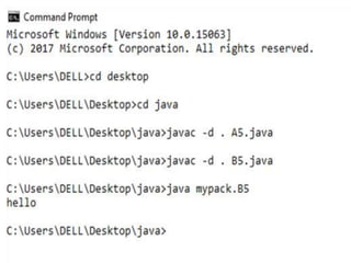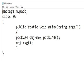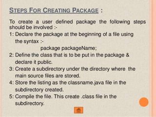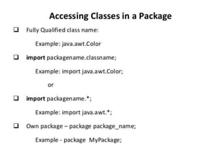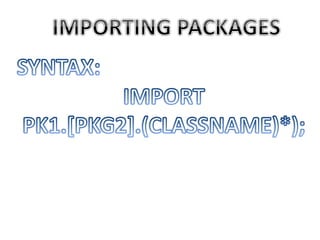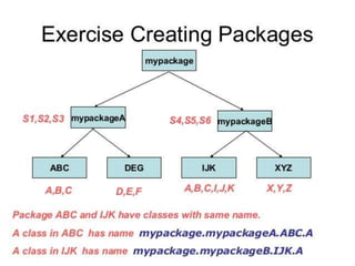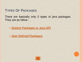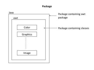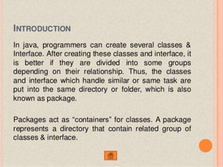 This document discusses packages in Java. It defines packages as a way to organize Java code and provides examples of built-in Java packages like java.lang and java.awt. It explains the different types of packages, the rules for packages, and how to create and access custom packages. Examples are provided to demonstrate importing and using classes from packages in an applet program.