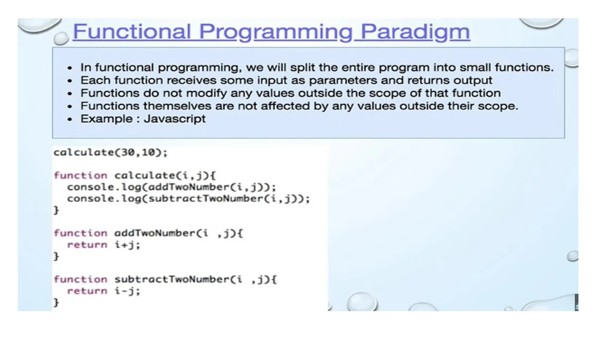 mathematical functions and avoid changing state or mutable data. Examples