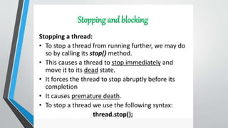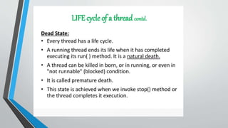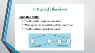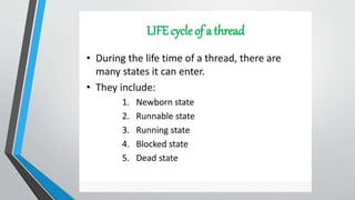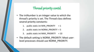 2) It provides examples of creating threads by extending the Thread class and implementing the Runnable interface. Methods like start(), run(), sleep(), setPriority(), getPriority() are discussed.