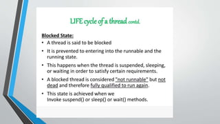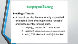 1) The document discusses various topics related to Java multithreading including introduction to threads, creation and life cycle of threads, stopping and blocking threads, using thread methods, thread priority, thread synchronization, and inter-thread communication.