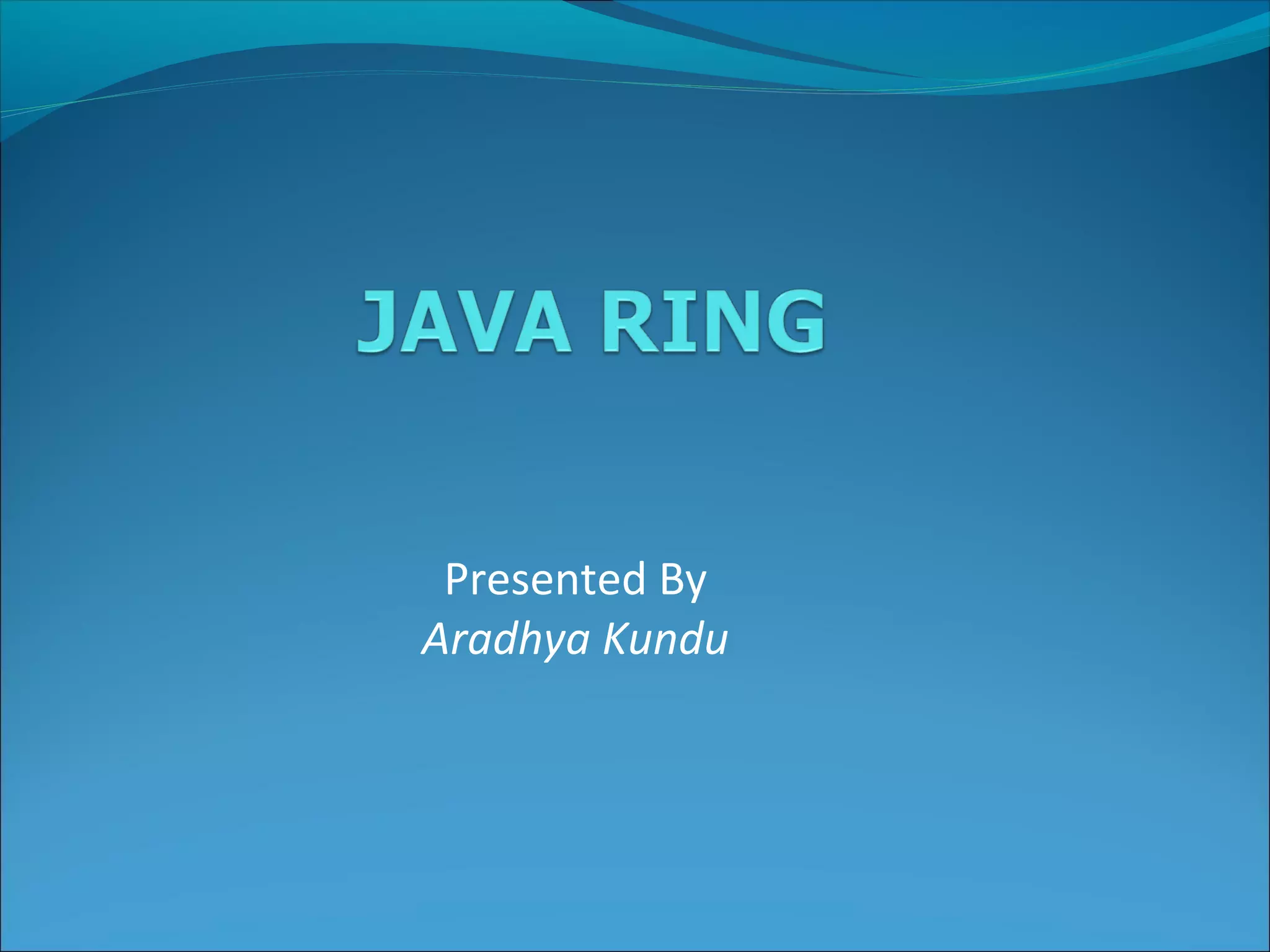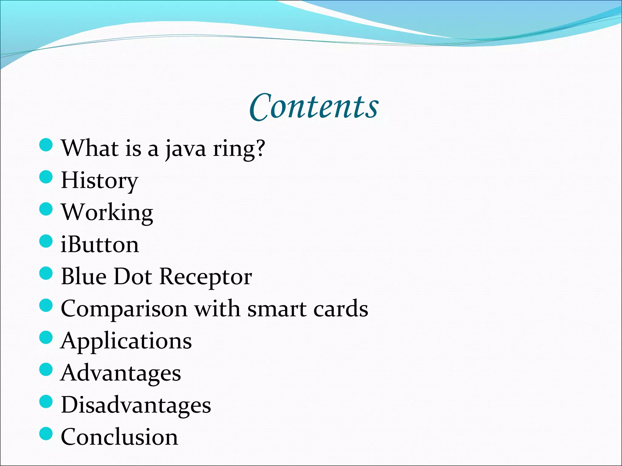 The document discusses the Java ring, which is a stainless steel ring containing a computer chip called an iButton that stores user information and runs Java applets. It was introduced in 1998 to provide personalized services. The ring communicates with readers through the iButton and 1-wire protocol with a touch. Applications include access control, time/attendance, e-cash, and more. It has advantages like convenience and security but also risks less parental control and privacy issues.
