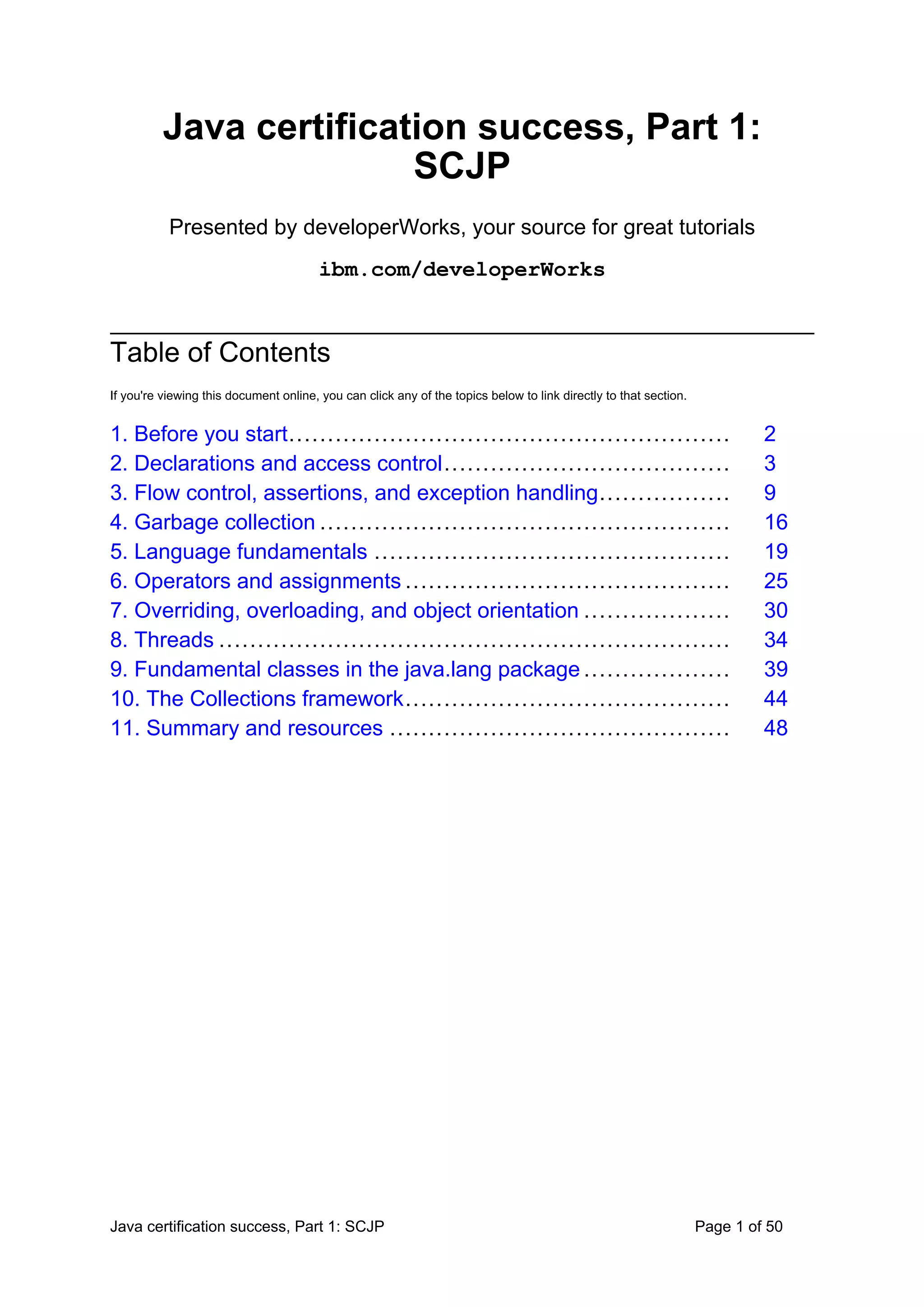 The document gives examples of each concept and is intended to help readers prepare for the SCJP certification exam by learning about its main objectives