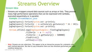 This document provides an overview of Java SE 8 Streams. It discusses how streams are wrappers around data sources that provide high performance operations using lambdas. Core stream methods like forEach(), map(), filter(), findFirst() are covered. Streams are lazy and can be parallelized. Streams output to common data structures like arrays and lists. Examples are provided to demonstrate creating streams from collections, using core stream methods, and converting streams back to pre-Java 8 data structures.