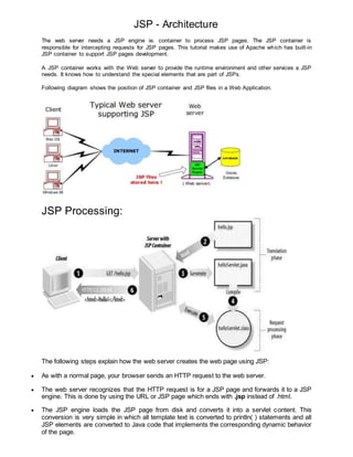 The document provides information on Java Server Pages (JSP) technology. It discusses that JSP allows inserting Java code in HTML pages using special tags. JSP components combine HTML, XML elements, and embedded JSP actions and commands to create dynamic web pages. JSP tags can be used for tasks like database access, user preferences, and sharing information across requests and pages. The document also explains the advantages of JSP over other technologies like performance, portability, and access to Java APIs. It describes the JSP architecture, processing lifecycle involving compilation to a servlet, initialization, execution, and cleanup. Finally, it discusses JSP application design elements like scriptlets, declarations, expressions, and comments.