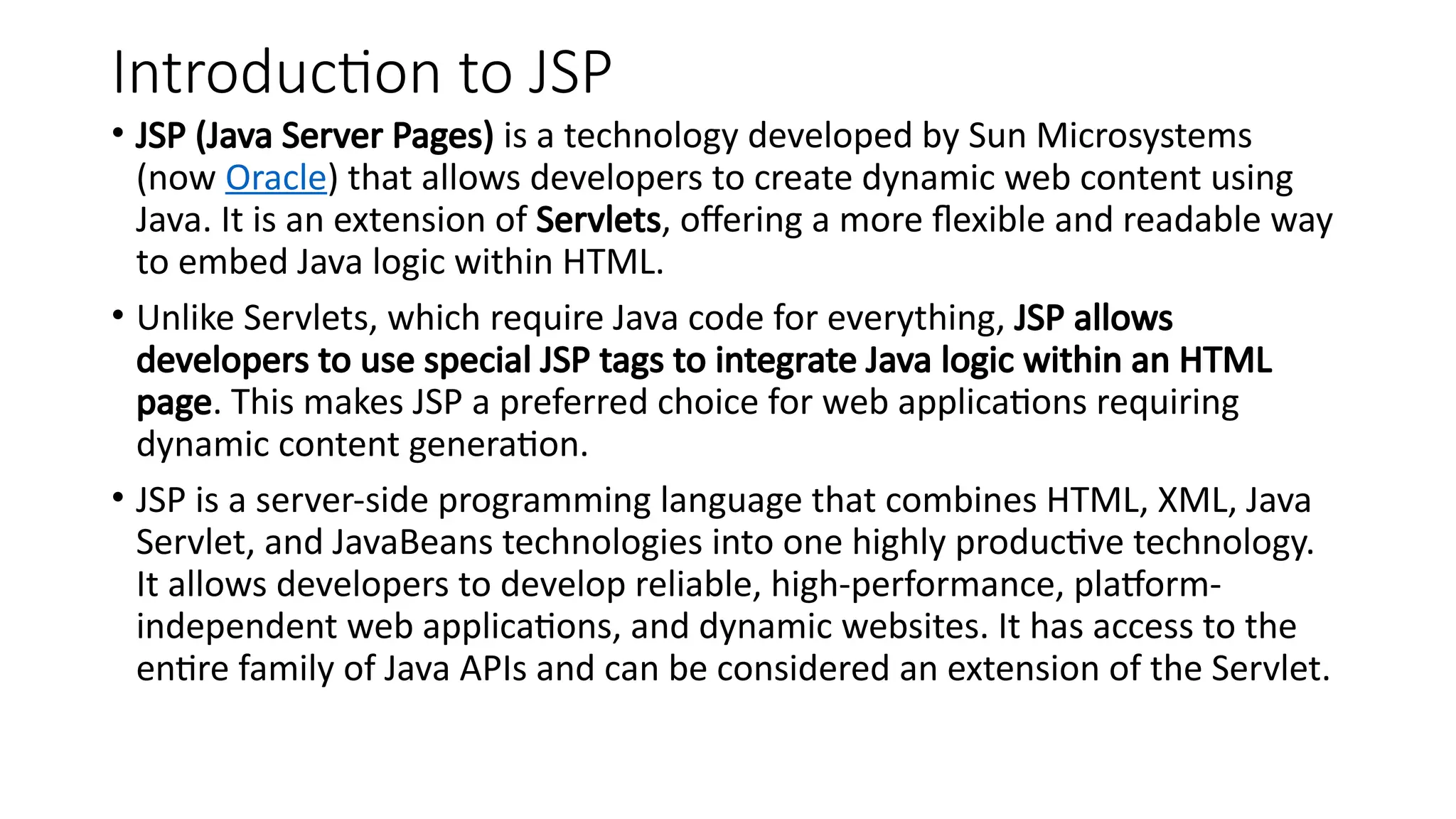 •JSP (Java Server Pages) is a technology developed by Sun Microsystems