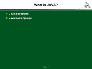 The document provides an overview of Java as a programming language and platform, highlighting its key features such as simplicity, object-oriented structure, platform independence, security, robustness, and multi-threading. It explains Java's compilation into bytecode which allows it to run on various platforms through the Java Virtual Machine (JVM). Additionally, the document outlines the requirements to run Java programs, including the Java Development Kit (JDK) and Java Runtime Environment (JRE).