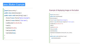 The document provides a comprehensive guide to Java Swing, a part of Java Foundation Classes (JFC) for creating window-based applications with platform-independent lightweight components. It covers important classes like JButton, JLabel, JTextField, JCheckBox, and more, detailing their usage, methods, and examples for implementation. Additionally, it explains layout management, event handling, and various Swing components such as menus and dialogs.