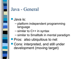 Java is an object-oriented programming language that is platform independent, allowing code to run on any device. It features automatic memory management, strong typing, and multi-threading. Java code is compiled to bytecode that runs on a Java Virtual Machine, providing platform independence. Methods and classes encapsulate code and data, and inheritance, polymorphism, and interfaces support object-oriented programming.