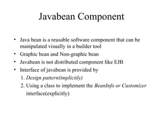 This document provides an overview of Java Bean component models. It discusses that Java beans are reusable software components that can be visually manipulated in builder tools. It also describes the different types of ports beans can have including methods, properties, events sources, and event sinks. The document outlines how to implement properties, events, and listeners in beans to make them customizable. It also discusses how beans can be made persistent through serialization and how customizers can provide customized user interfaces for complex beans.