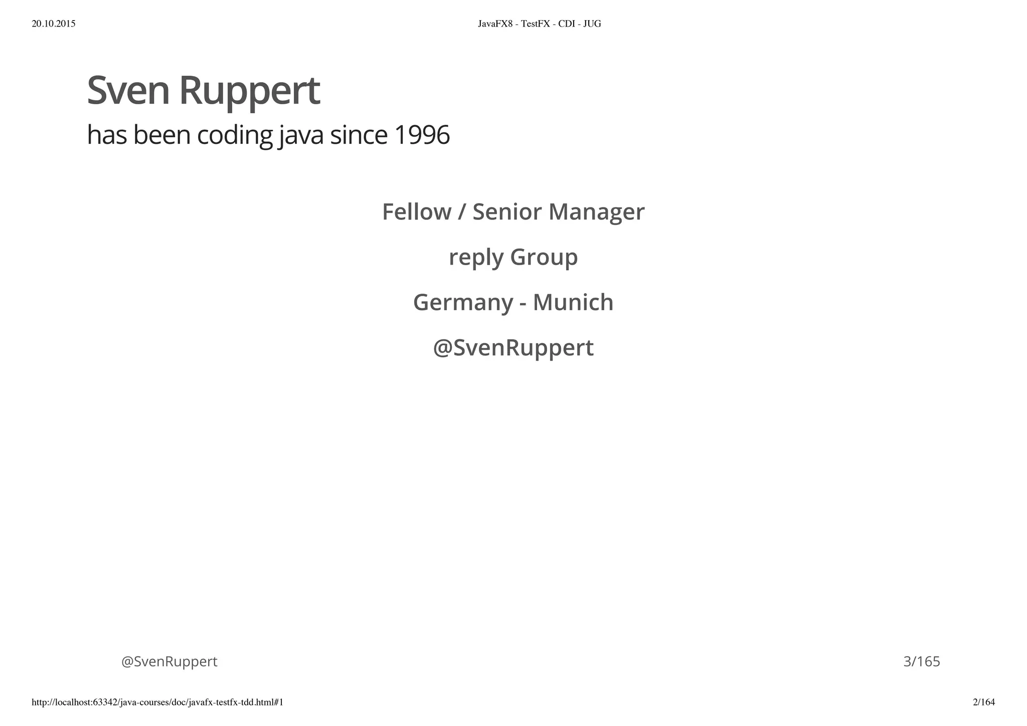 The document discusses testing JavaFX applications using TestFX and JUnit. It provides a simple "Hello World" JavaFX application example and extracts the application logic into separate classes that can be tested independently. This allows testing the logic with JUnit unit tests while avoiding the need to launch the full JavaFX application. The document also recommends using JMH microbenchmarks to test the performance of application services as part of a Test Driven Development approach.