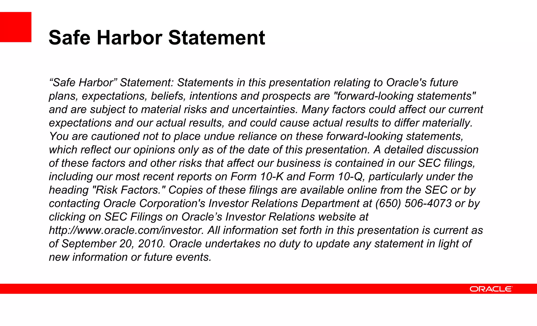 The document provides a "Safe Harbor" statement for Oracle regarding forward-looking statements made in presentations. It cautions readers that actual results could differ materially from what is stated, due to various risk factors. Readers are advised to not rely solely on forward-looking statements and to review Oracle's SEC filings for detailed discussions of risk factors. All information in the presentation is current as of September 20, 2010. Oracle will not update statements in light of new information or future events.