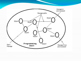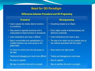 The document provides an overview of object-oriented programming concepts and Java programming. It discusses key OOP concepts like abstraction, encapsulation, inheritance, polymorphism and classes. It then covers the history and development of Java, describing how it was initially created at Sun Microsystems to develop software for consumer electronics but was later targeted towards internet programming. The document also lists some of Java's key characteristics like being simple, secure, portable, object-oriented, robust and multithreaded.